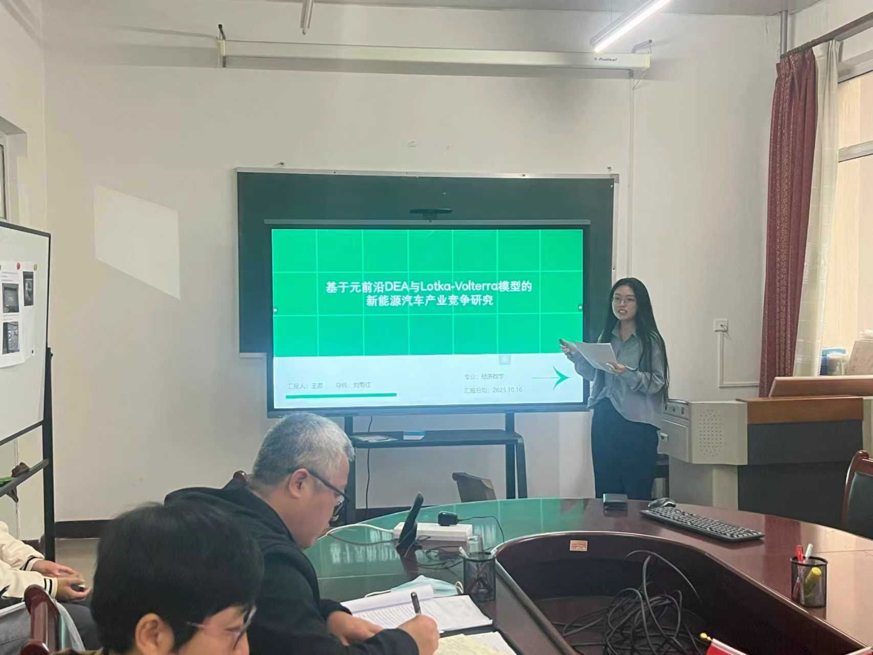 最后,王荔同学汇报了《基于元前沿DEA与Lotka-Volterra模型的新能源汽车产业竞争研究》的开题报告。该研究拟用元前沿DEA方法评估产业效率,并引入生态学中的Lotka-Volterra模型模拟新能源汽车产业内不同技术路线或企业间的竞争共生关系,视角新颖,具有重要的理论价值和现实意义。