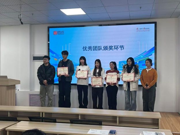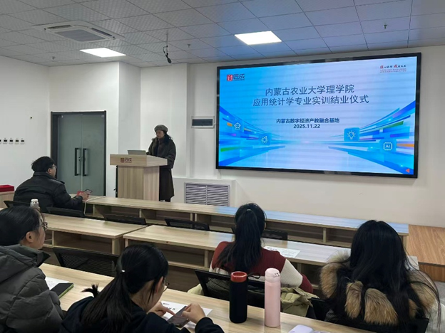 11月22日下午,实训结业仪式如期举行,由企业北方区总经理赵静主持。仪式在庄严的国歌奏唱中拉开序幕,随后学生代表刘海欣汇报实习成果,全面展示五天的学习收获与成长;现场公布优秀团队名单并举行颁奖仪式,鼓励同学们以榜样为标杆,深化实践认知。最后,企业负责人对本次实习进行总结,肯定了同学们的积极表现与学习成果,同时希望大家将实习所得转化为专业能力,在应用统计学领域持续深耕,为后续学习与职业发展积累更多实践经验。