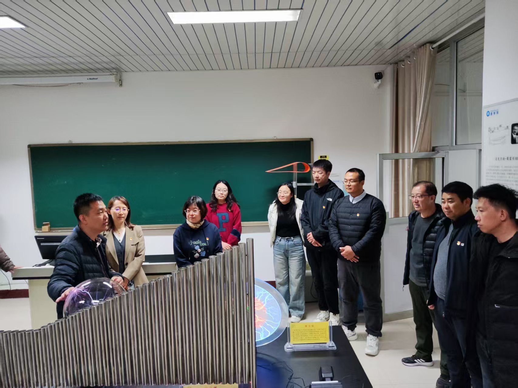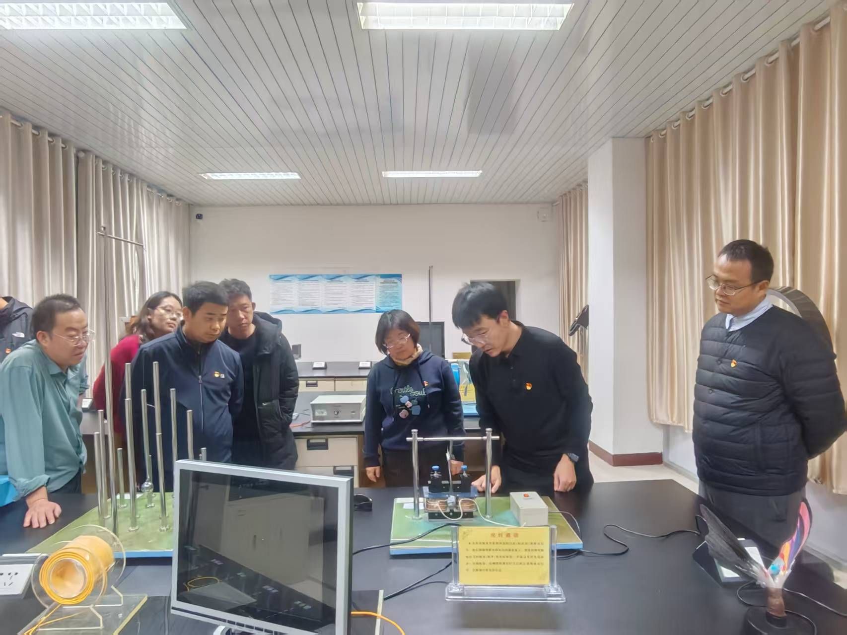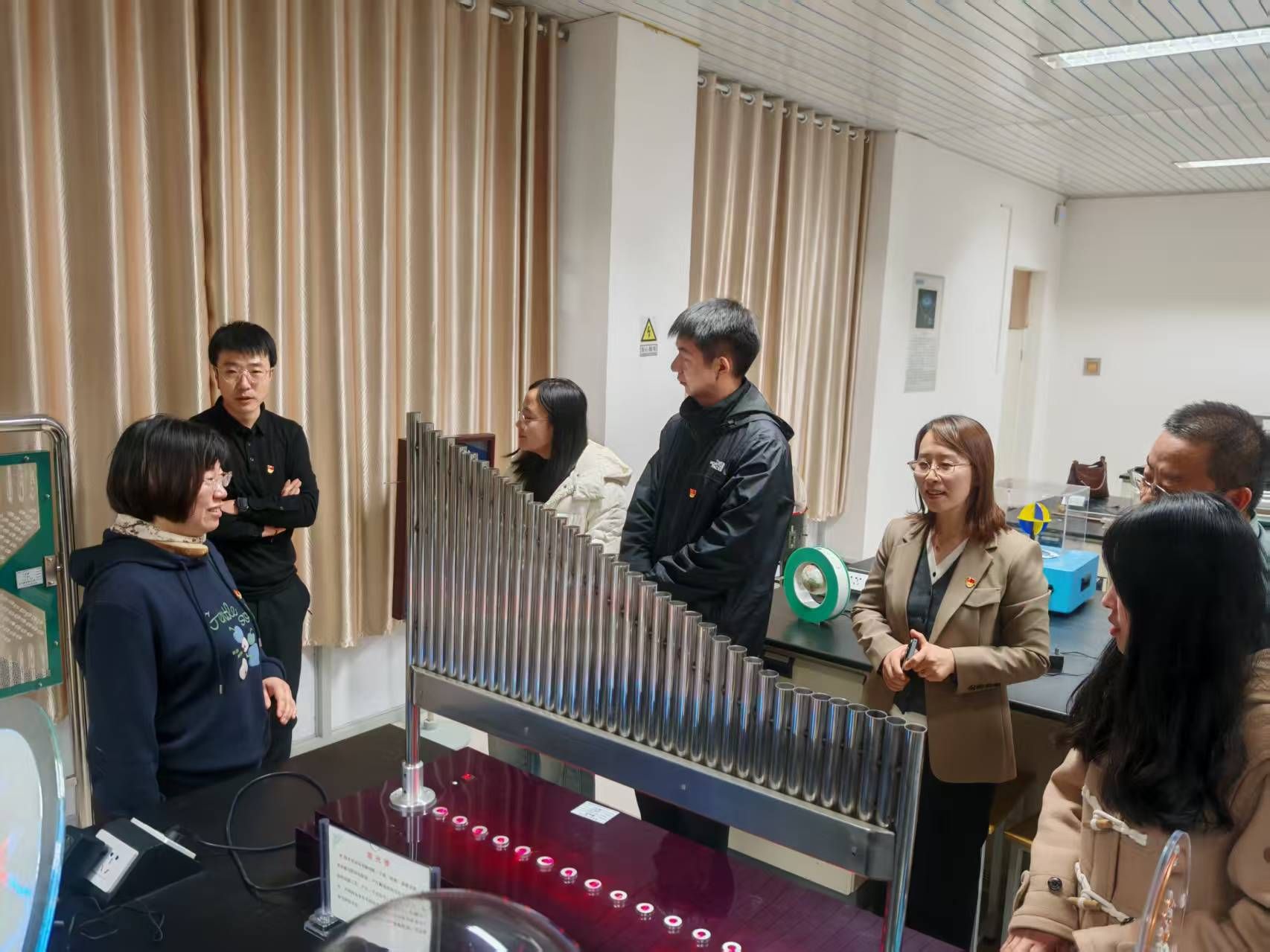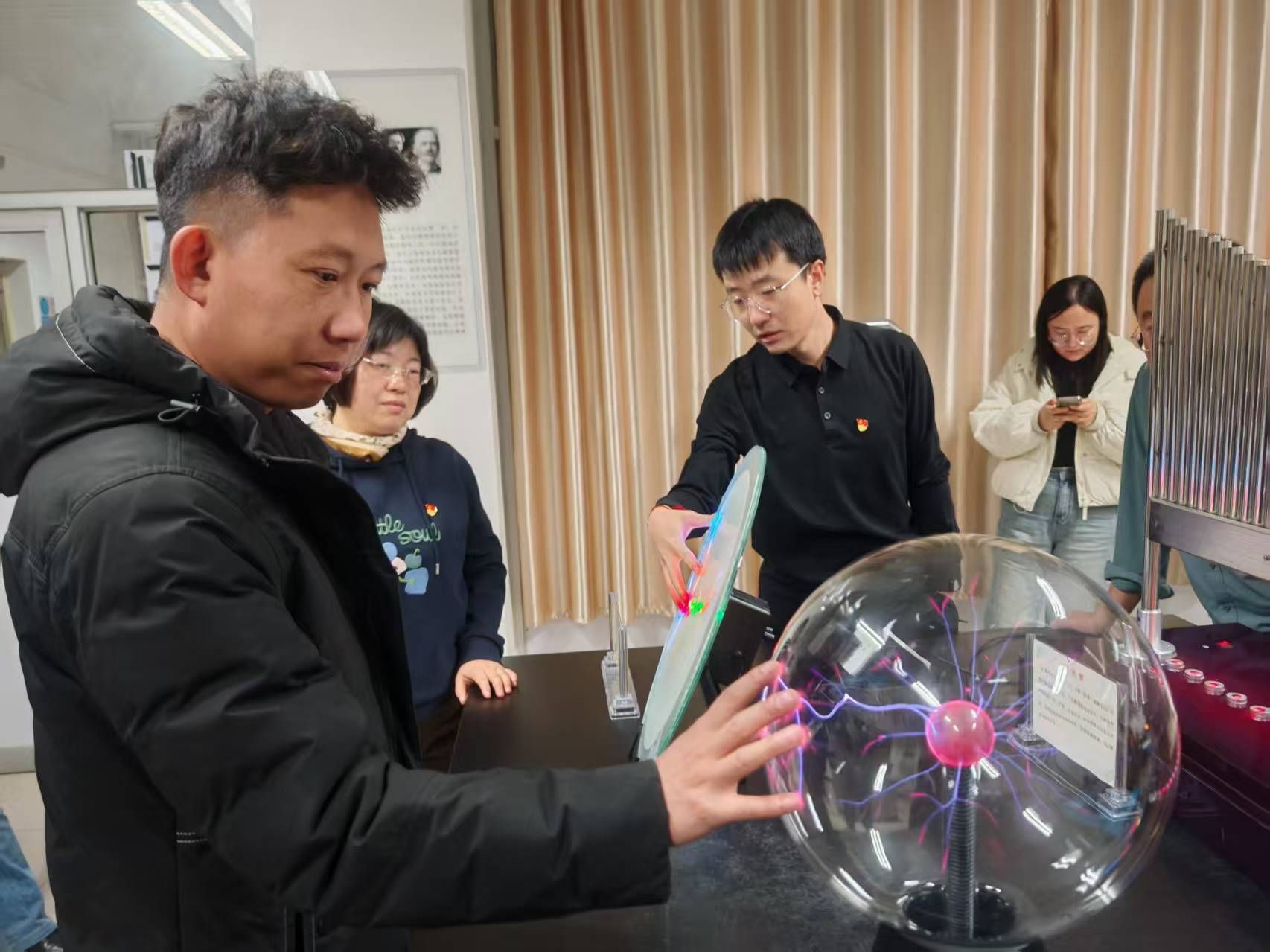 活动伊始,与会人员实地参观了理学院物理科普实验室。物理与电子科学系乌云达来、宋娜两位教师担任主讲,系统展示了辉光球、电磁感应演示试验仪、光纤通信、磁悬浮灯泡等70余个经典实验场景。张强、石磊、昝宇海、白海平、王焕、李根小、包乌日塔等七名党员教师组成“党员示范岗”,全程提供专业讲解与安全指导,展现出党员教师在科普实践中的先锋作用。参观过程中,各校教师亲身体验了物理与电子科学系在科普转化方面的成果。从“静电魔法”的趣味互动,到“激光琴”“伯努利悬浮球”等互动装置的设计,支部党员将抽象的科学原理转化为可感知、可参与的教学情境,使参观者在沉浸式体验中感受“党建+科普”融合的实践成效。