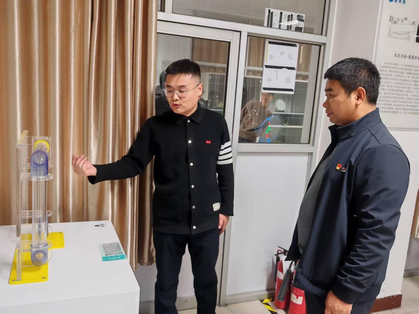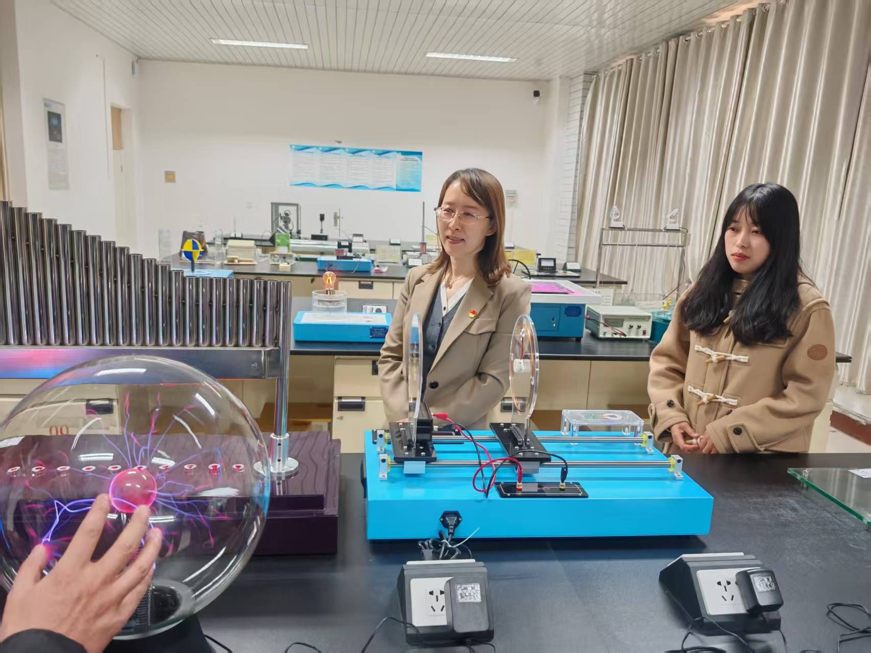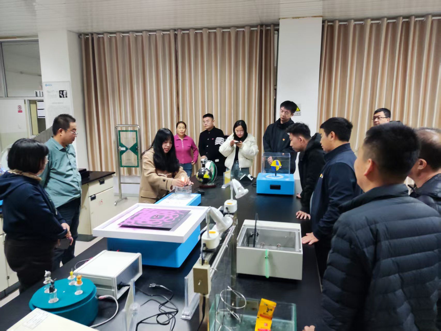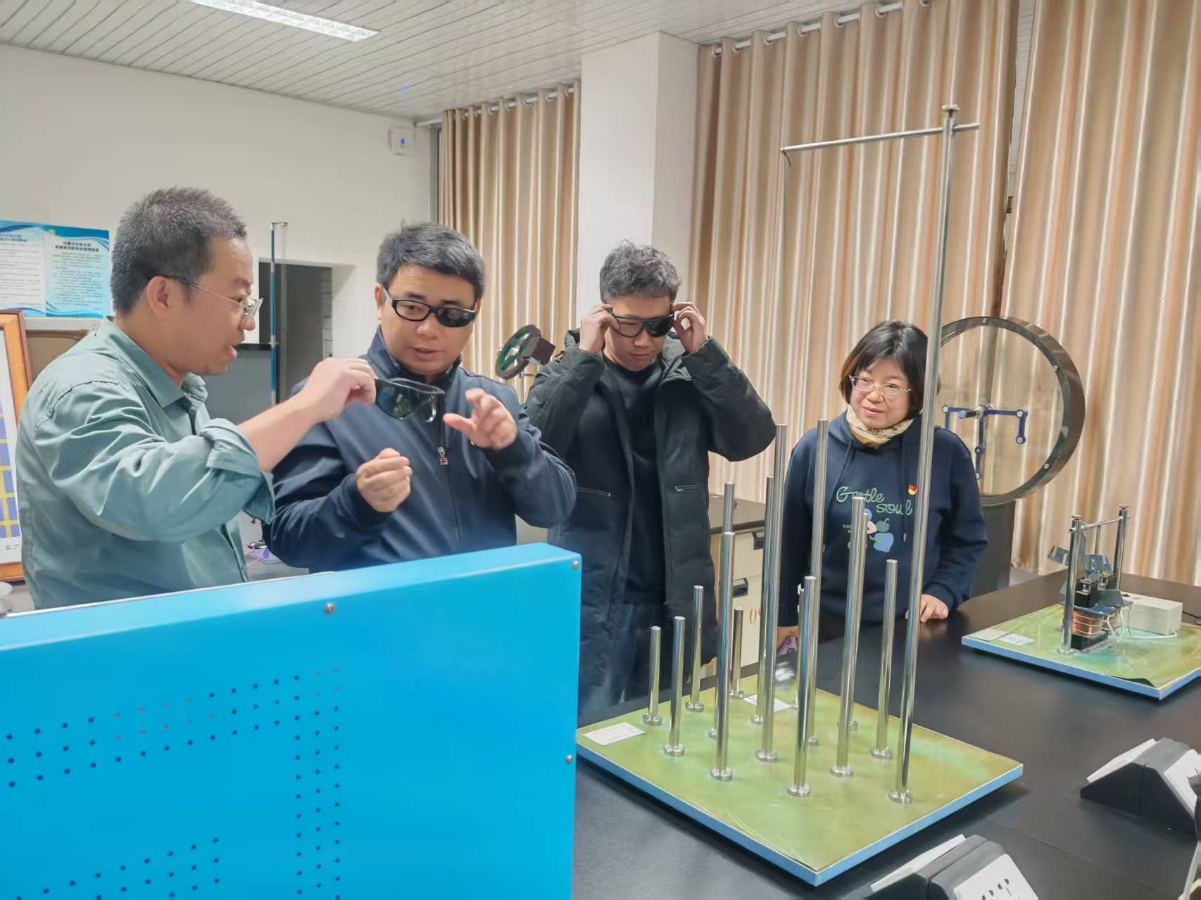 活动伊始,与会人员实地参观了理学院物理科普实验室。物理与电子科学系乌云达来、宋娜两位教师担任主讲,系统展示了辉光球、电磁感应演示试验仪、光纤通信、磁悬浮灯泡等70余个经典实验场景。张强、石磊、昝宇海、白海平、王焕、李根小、包乌日塔等七名党员教师组成“党员示范岗”,全程提供专业讲解与安全指导,展现出党员教师在科普实践中的先锋作用。参观过程中,各校教师亲身体验了物理与电子科学系在科普转化方面的成果。从“静电魔法”的趣味互动,到“激光琴”“伯努利悬浮球”等互动装置的设计,支部党员将抽象的科学原理转化为可感知、可参与的教学情境,使参观者在沉浸式体验中感受“党建+科普”融合的实践成效。