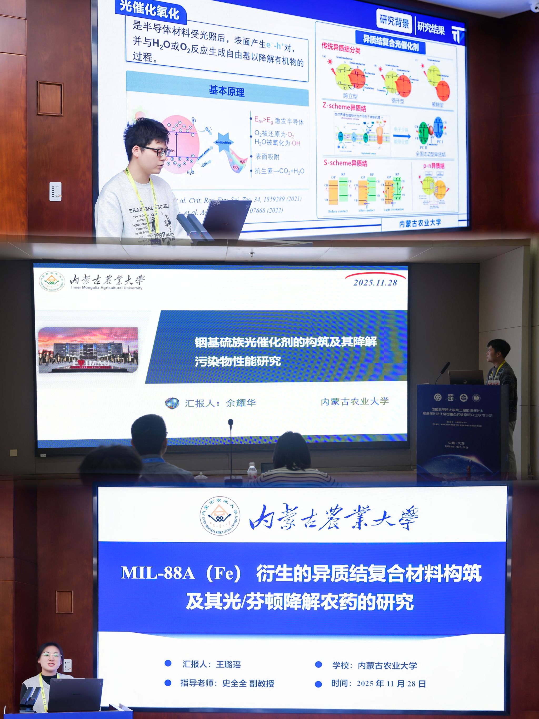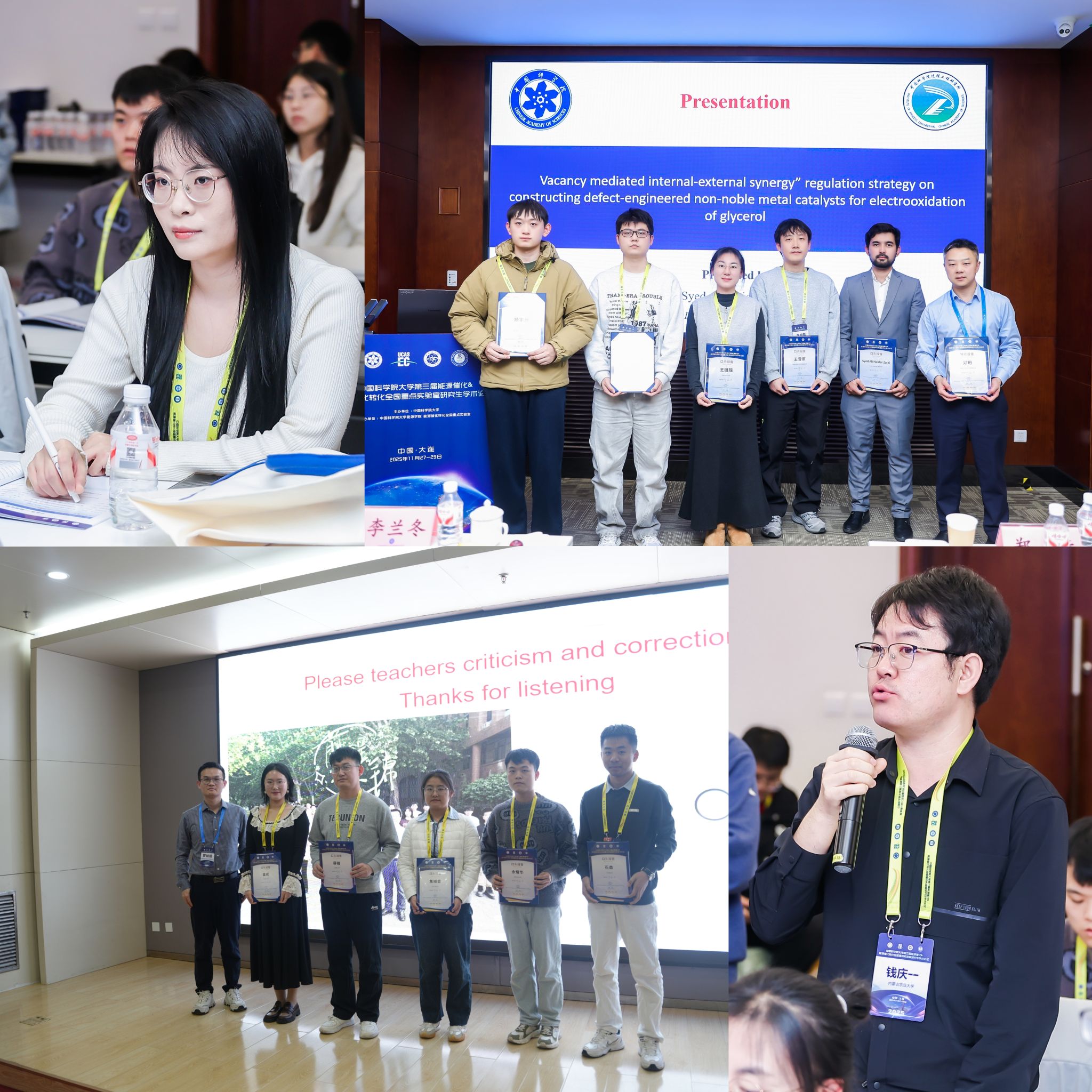 我院钱庆一老师带队,博士研究生熊祺,硕士研究生王璐瑶,李佳,余耀华参会并开展交流。其中熊祺,王璐瑶,余耀华三位研究生在会上分别作了题为《晶面诱导还原构筑AgBr/Ag0/TiO2{100} Z型异质结及其光催化降解四环素的研究》《MIL-88A(Fe)衍生的异质结复合材料构筑及其光/芬顿降解农药的研究》《铟基硫族光催化剂的构筑及其降解污染物性能研究》的分论坛报告。钱庆一老师与硕士研究生李佳分别以《金属催化剂电催化水分解性能研究》《MOF衍生的CeO2/Co3O4异质结材料,高效降解聚对苯二甲酸乙二醇酯塑料》为题做了Poster展示。