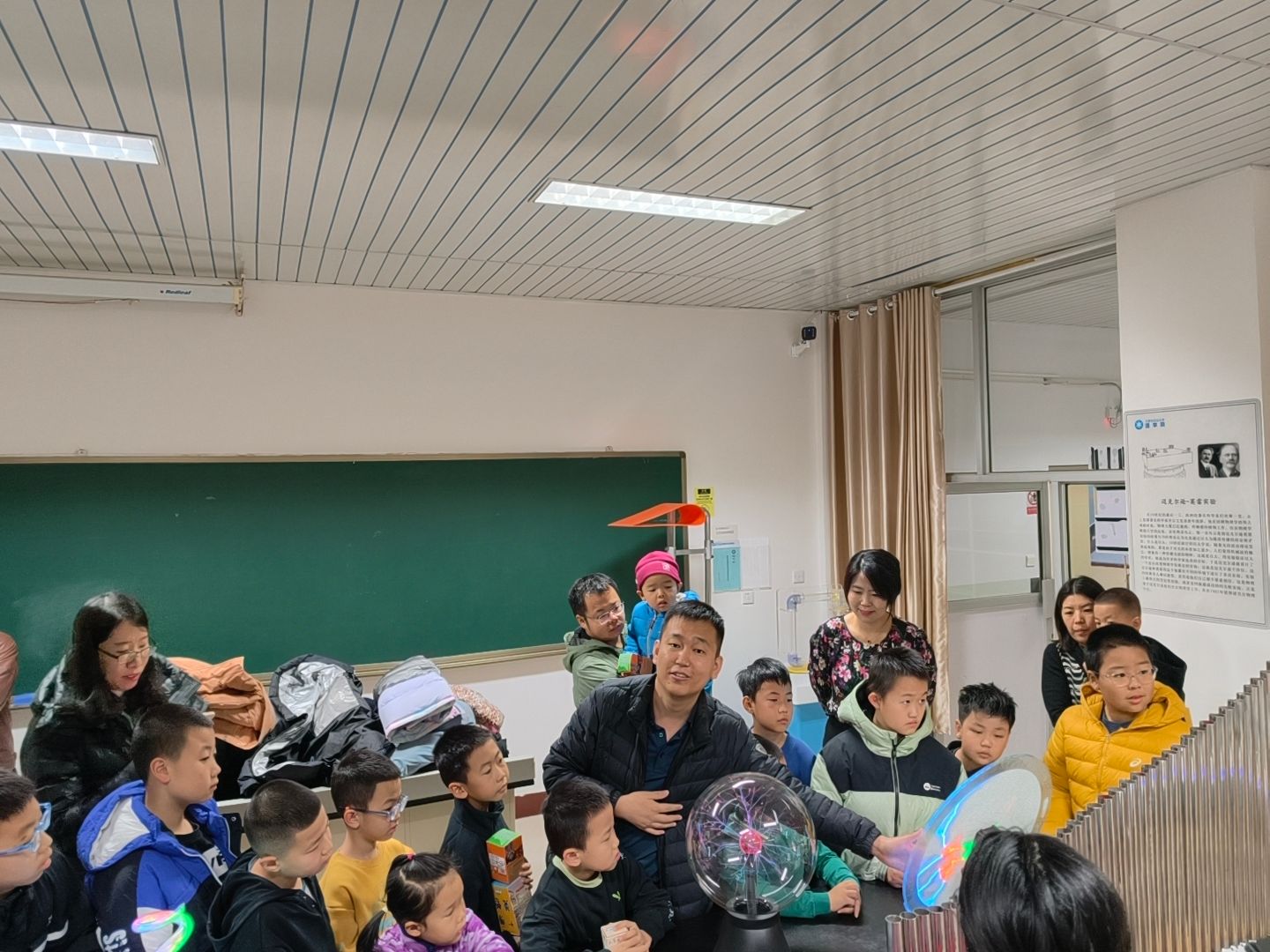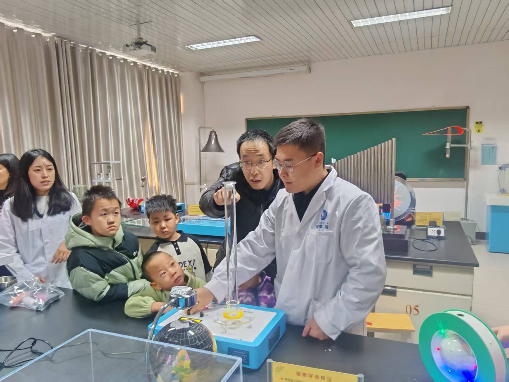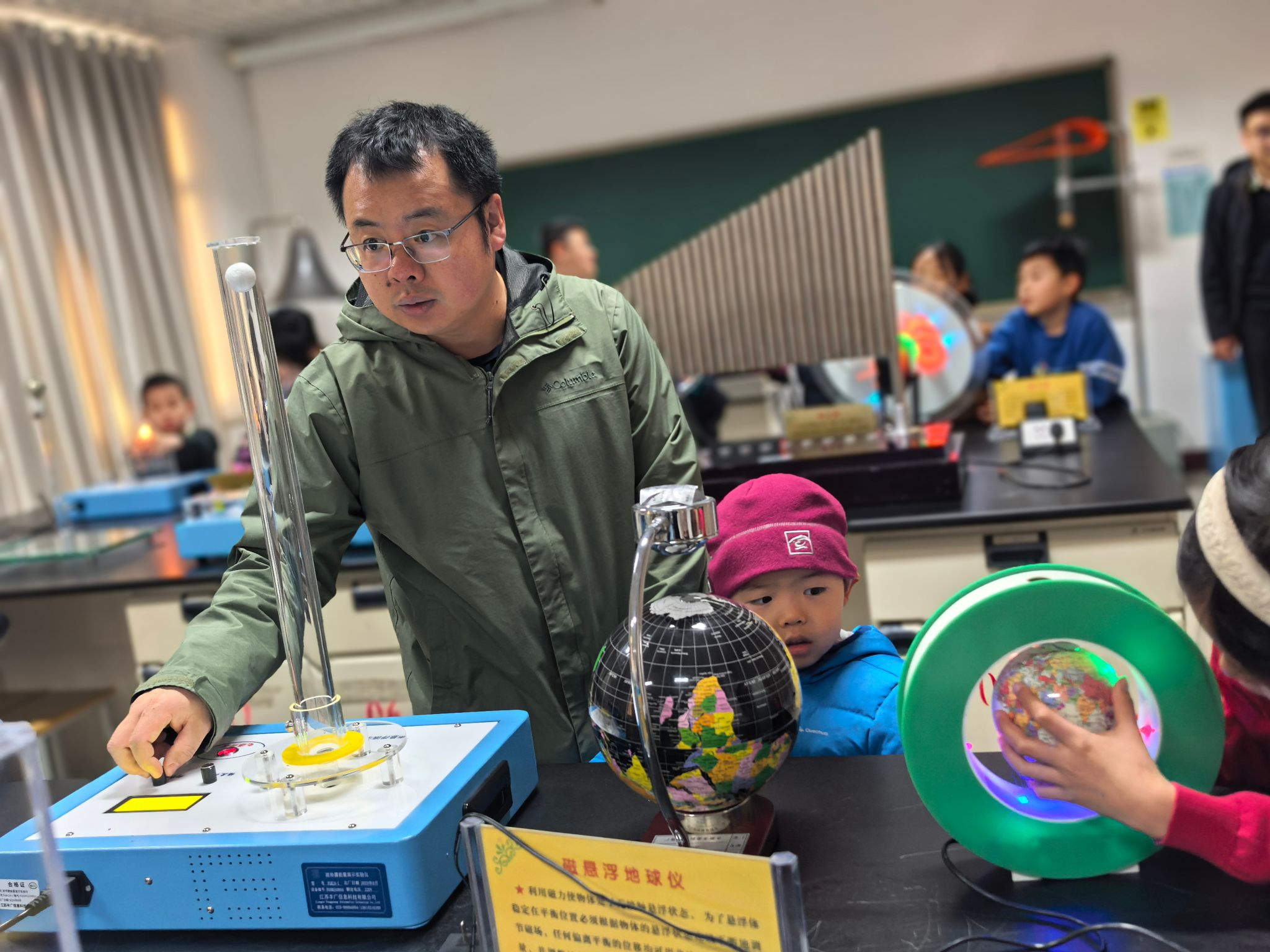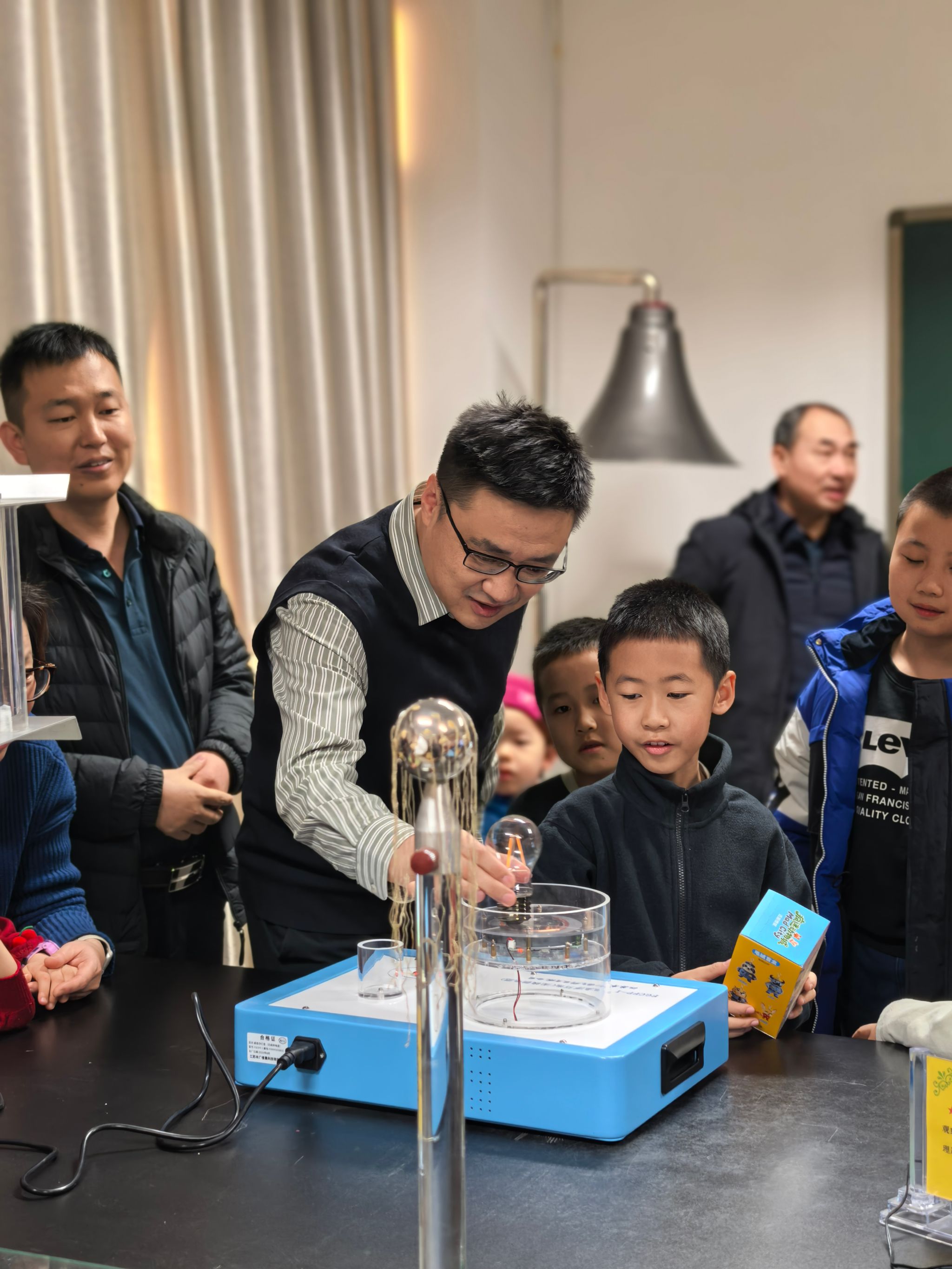 活动伊始,教职工亲子团队在专业教师引导下参观了物理科普实验室。崔艳玲、李晓龙、乌云达来、宋娜、官布五位教师系统讲解了辉光球、电磁感应演示仪、光纤通信、磁悬浮灯泡等70余项经典实验。由张强、石磊、昝宇海、白海平、侯晓飞、孟海红、包乌日塔七名党员教师组成的“党员示范岗”全程提供专业讲解与安全指导,将抽象物理原理转化为“静电魔法”“激光琴”等可触可感的互动体验,生动展现了党员教师在科普一线的先锋作用,体现了“党建+科普”融合的实践成效。
