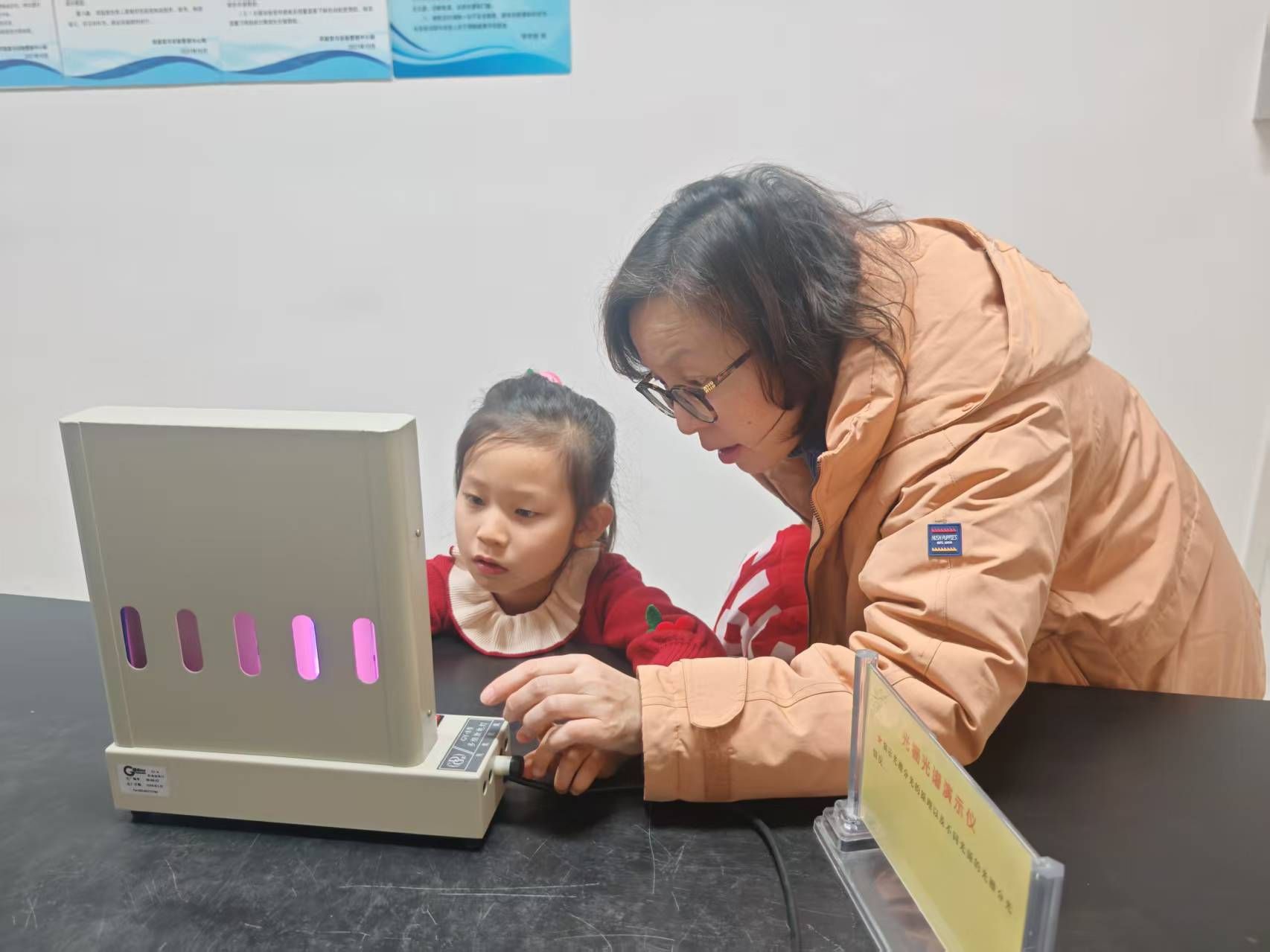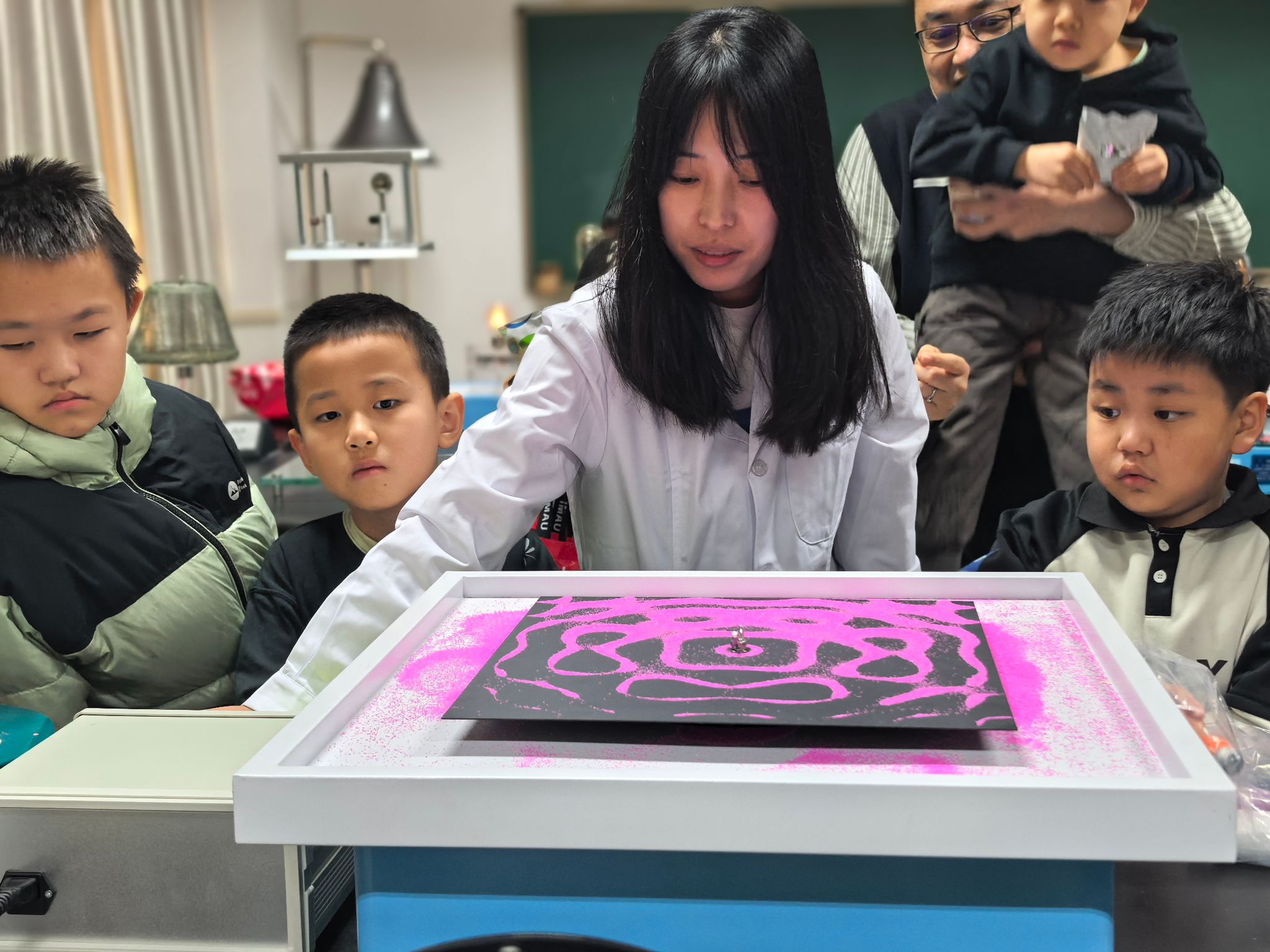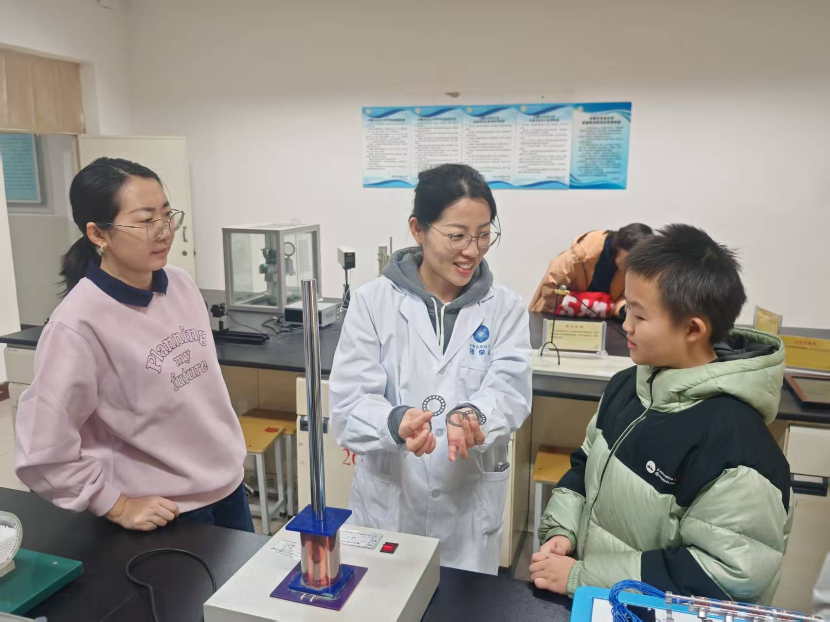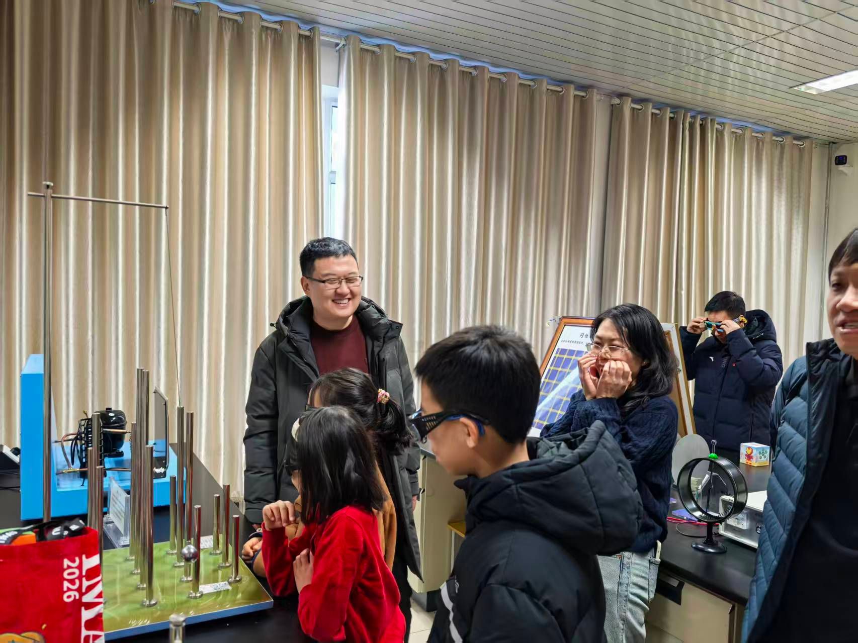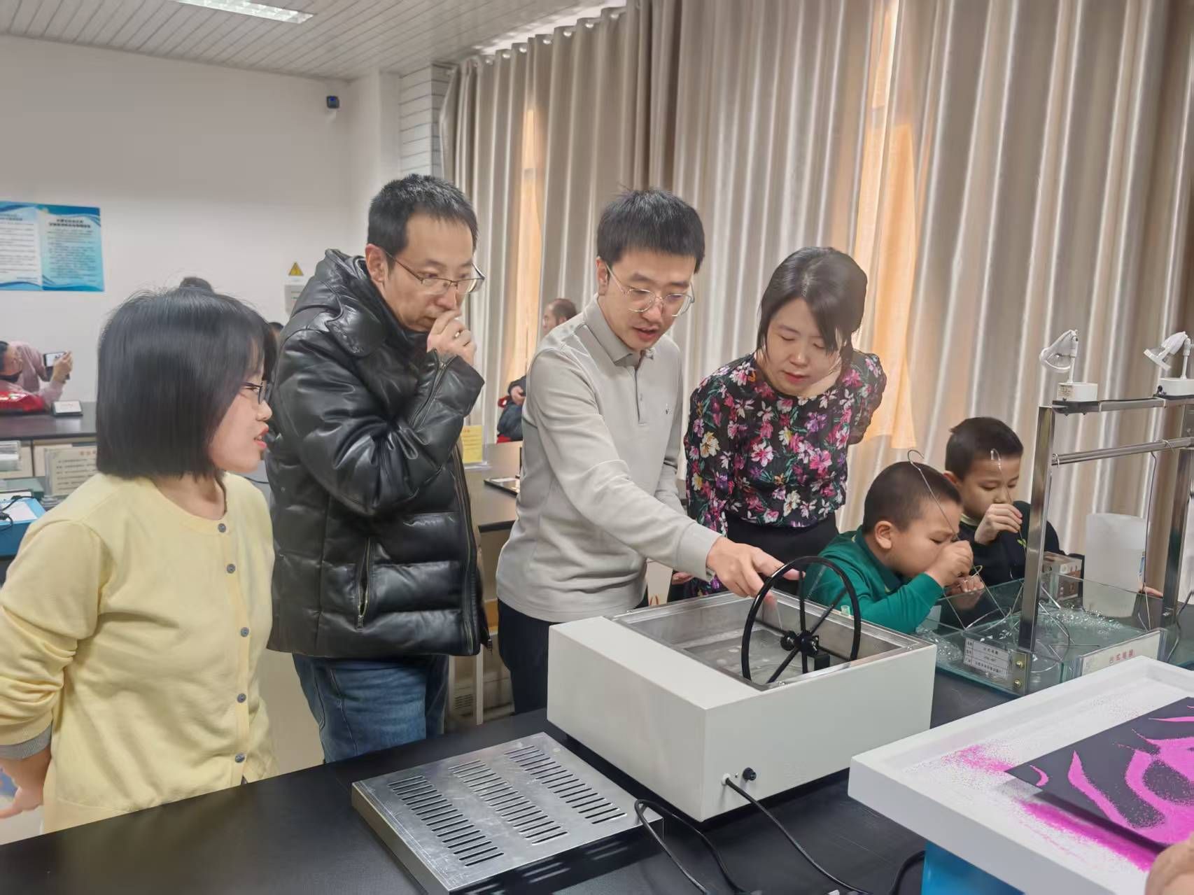 活动伊始,教职工亲子团队在专业教师引导下参观了物理科普实验室。崔艳玲、李晓龙、乌云达来、宋娜、官布五位教师系统讲解了辉光球、电磁感应演示仪、光纤通信、磁悬浮灯泡等70余项经典实验。由张强、石磊、昝宇海、白海平、侯晓飞、孟海红、包乌日塔七名党员教师组成的“党员示范岗”全程提供专业讲解与安全指导,将抽象物理原理转化为“静电魔法”“激光琴”等可触可感的互动体验,生动展现了党员教师在科普一线的先锋作用,体现了“党建+科普”融合的实践成效。