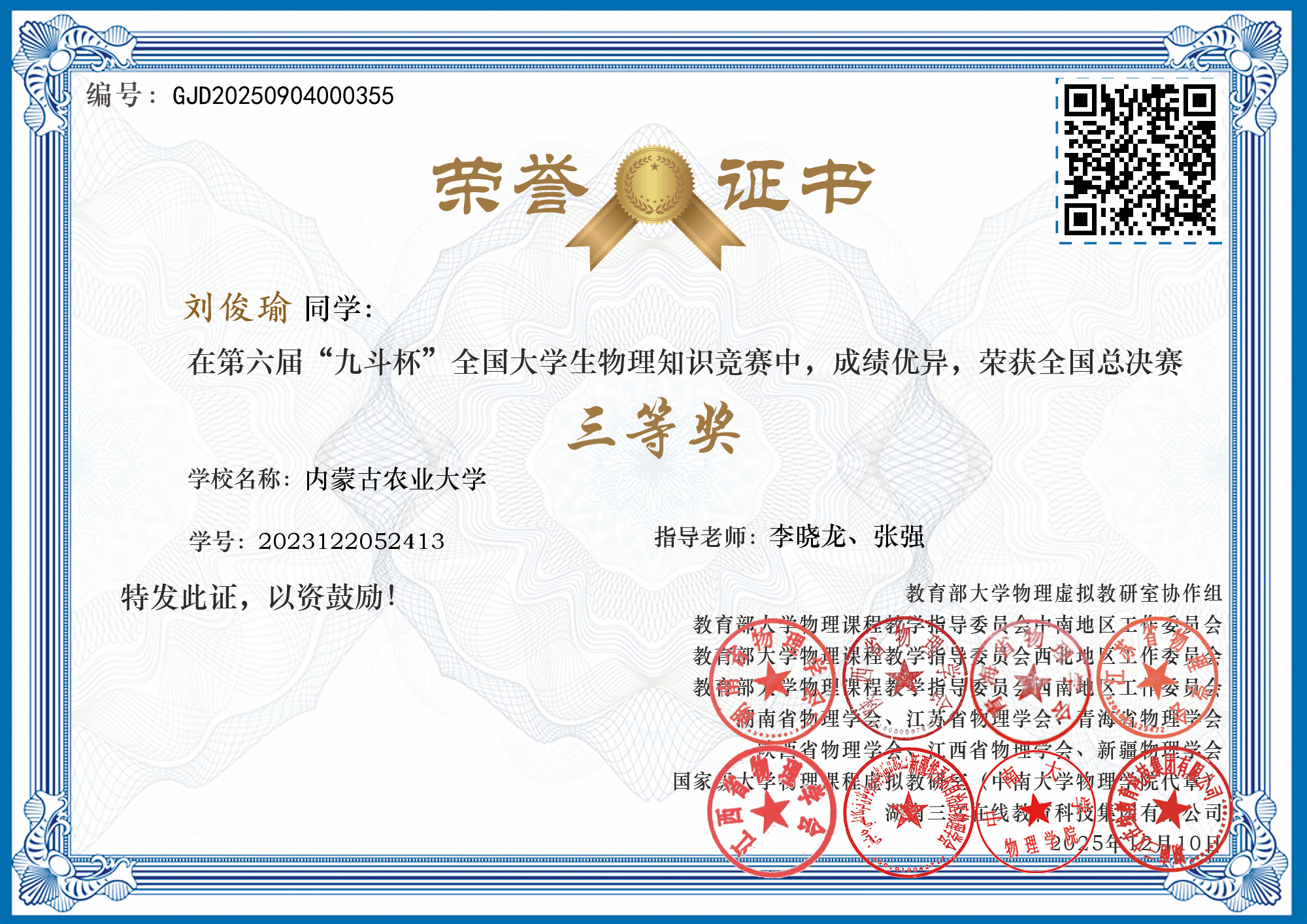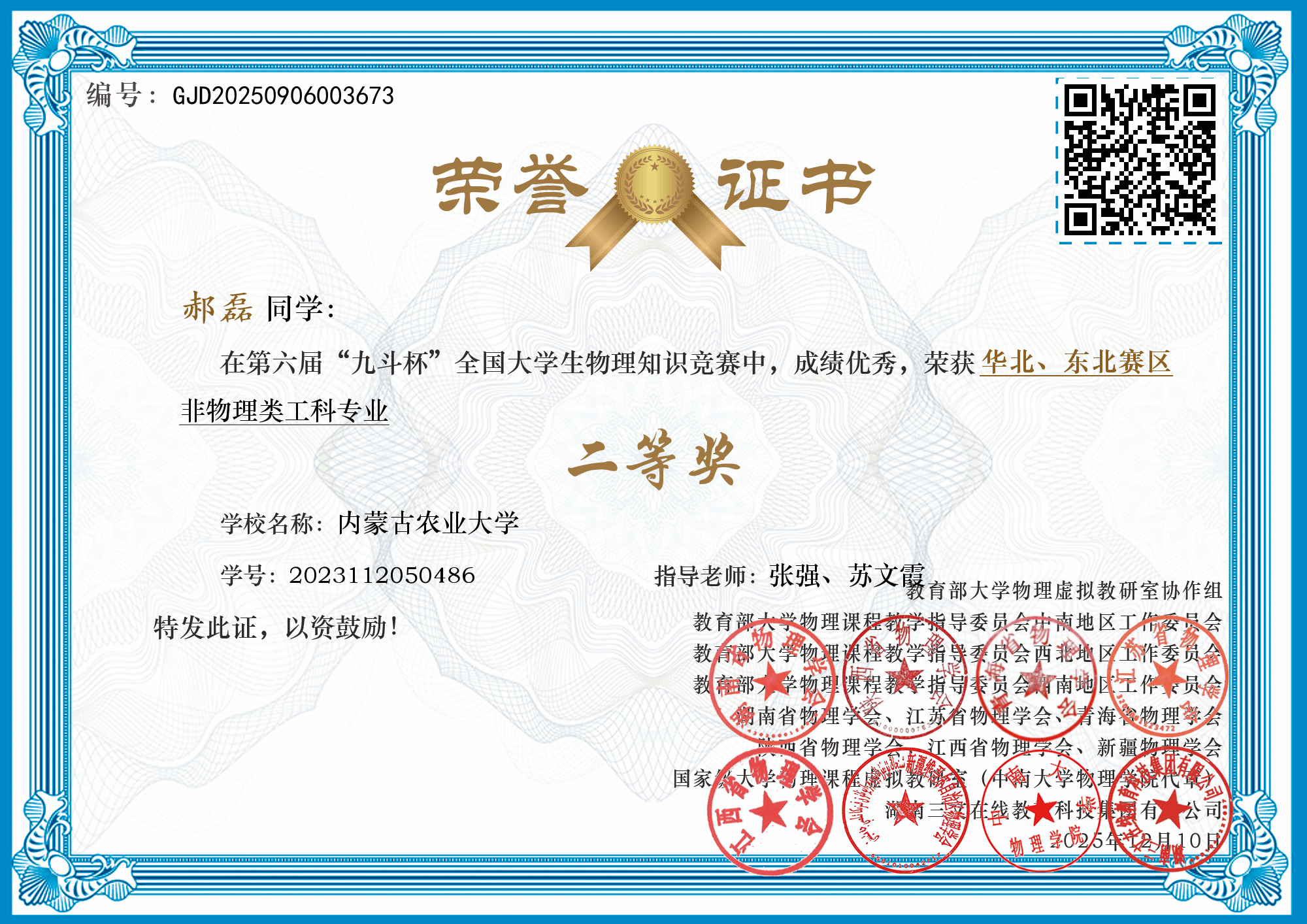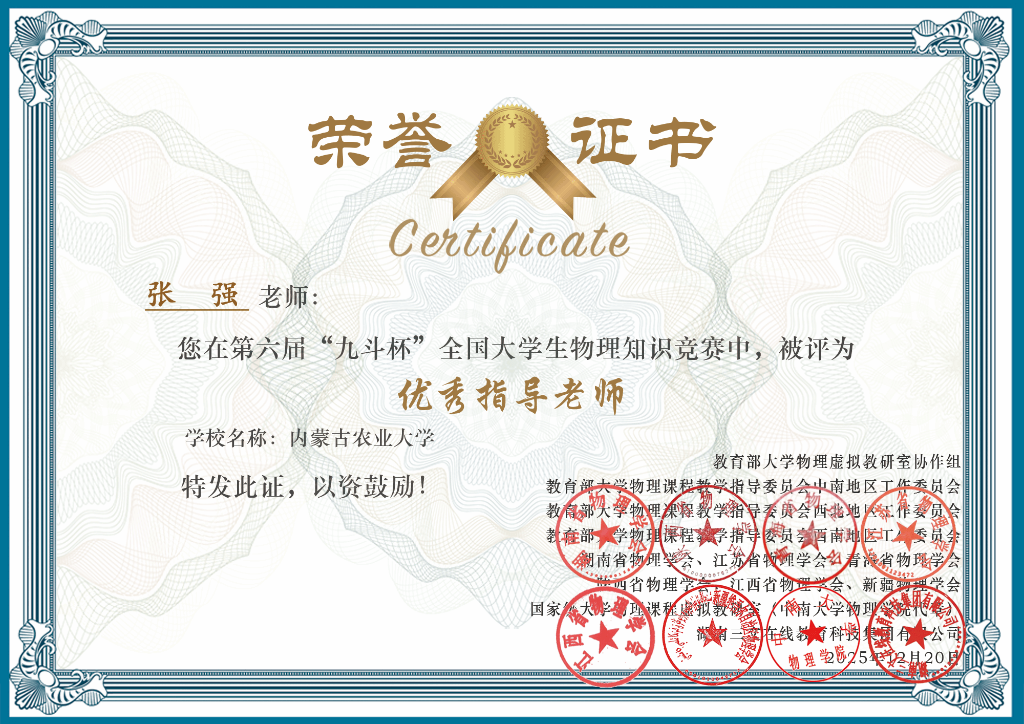 近日,第六届“九斗杯”全国大学物理课程知识竞赛决赛落幕。我校学生历经三周的激烈角逐,通过初赛、复赛、决赛选拔,荣获全国总决赛一等奖1项、二等奖5项、三等奖5项。荣获华北、东北赛区一等奖11项、二等奖12项、三等奖15项。学校同时获评“优秀组织奖”,张强副教授荣获“优秀指导教师”称号。