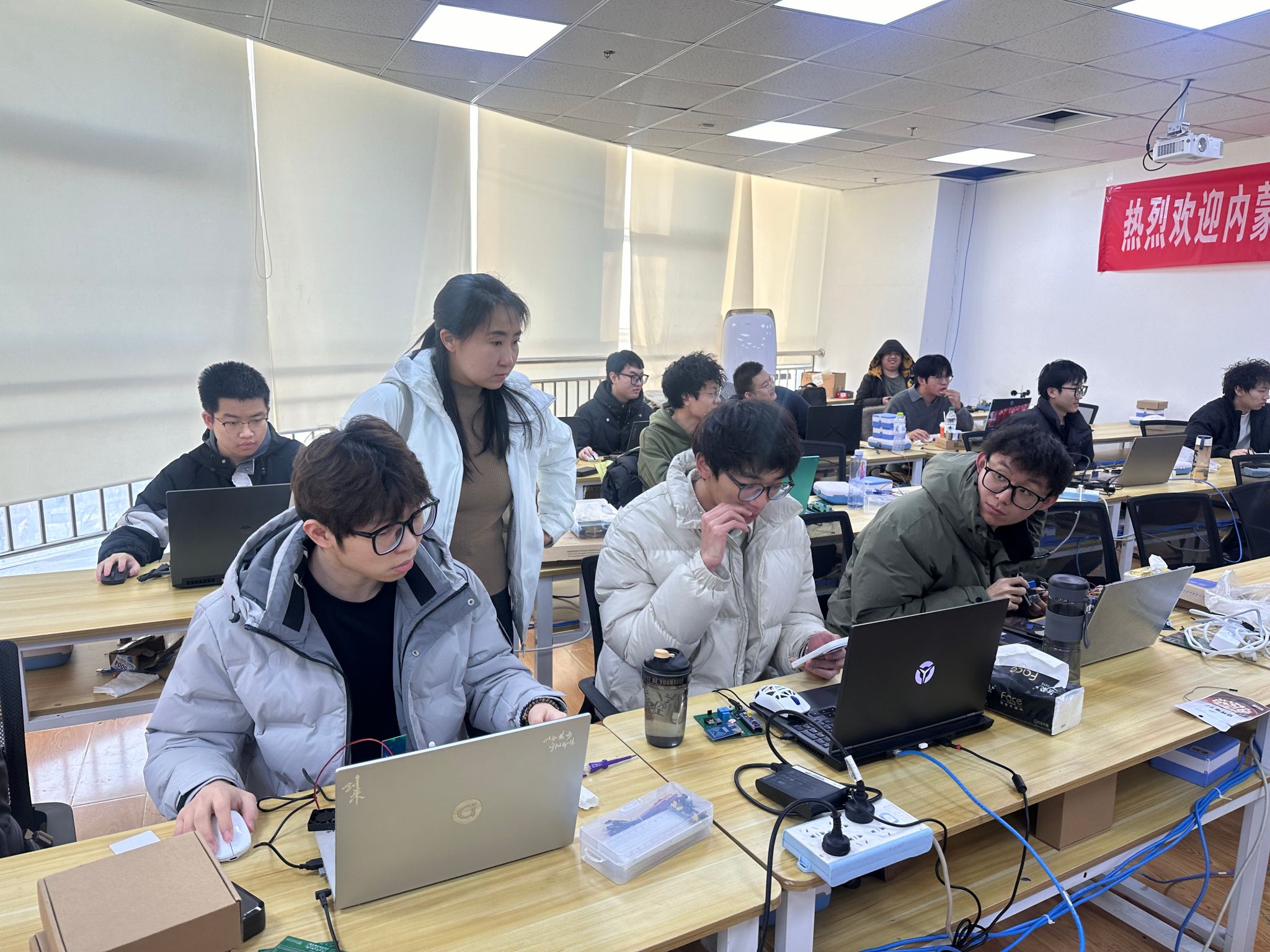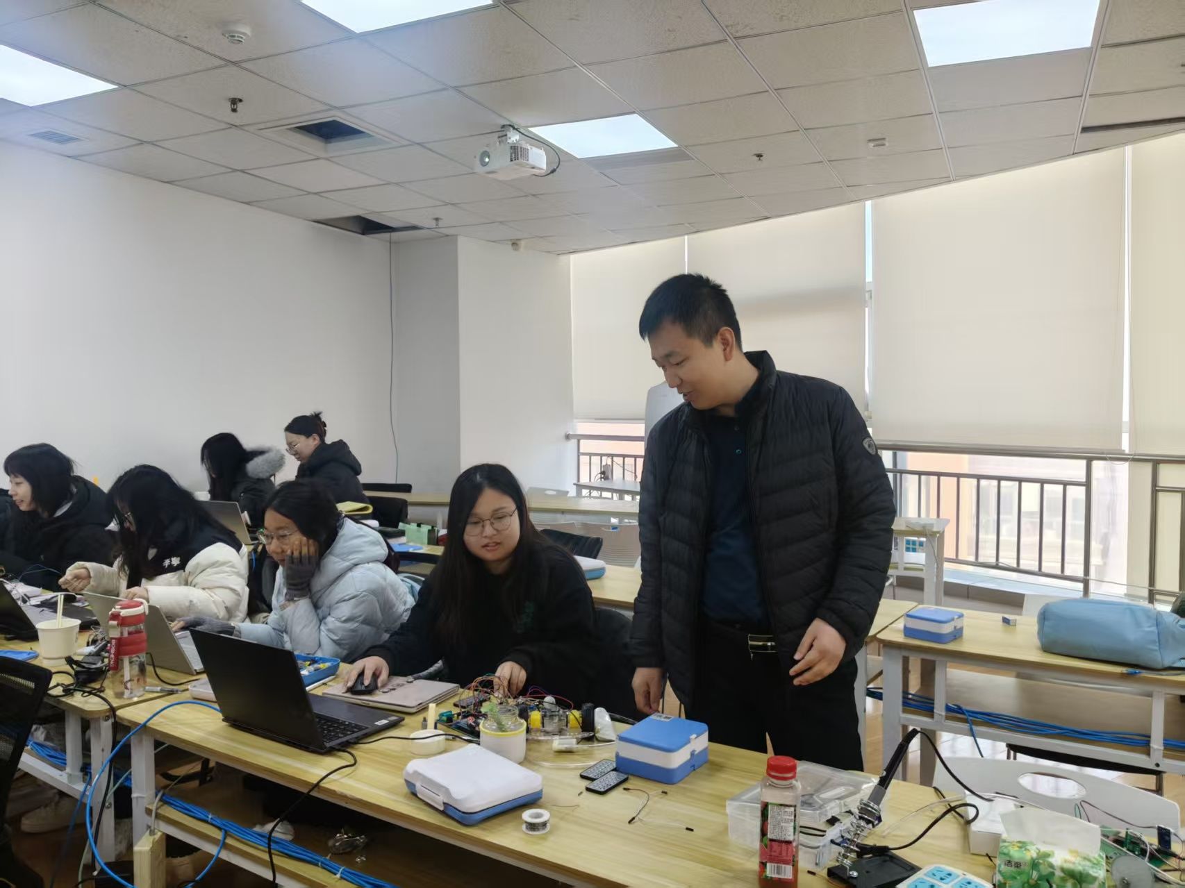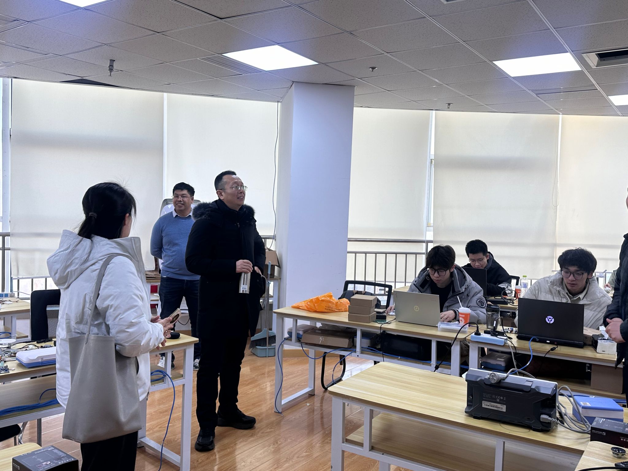 随后,全体人员实地参观企业实训基地,重点观摩了理学院22级电科班在校企“双导师制”模式下完成的毕业设计成果,双方围绕“电子科学与技术专业校企双导师制”的实施情况展开深入探讨。物理与电子科学系教工党支部详细介绍了22级43名学生赴青岛基地开展“嵌入式/物联网毕设特训营”的进展、阶段性成果及后续答辩安排,分享了校内导师在课题衔接与理论指导方面的经验。高慧强学党支部从企业视角出发,阐述了如何将产业技术需求转化为毕业设计课题,介绍了企业导师在实践教学、项目指导及学生思想引领中的作用。双方一致认为,“校企双导师制”是技术传授、价值塑造与工匠精神培育的重要平台,坚守立德树人根本任务,汇聚校企优势,形成协同育人合力。